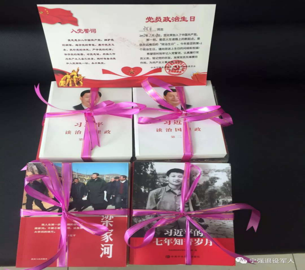 赠送一套励志图书。给党员赠送了《宁强红色印记》《之江新语》《习近平谈治国理政》《习近平的知青岁月》等书籍,希望党员不忘初心,强化宗旨意识。